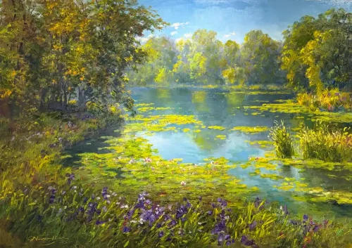 Mit kräftigen Pinselstrichen und einer harmonischen Farbpalette entstehen Werke voller Tiefe und Bewegung, die eine warme, positive Stimmung ausstrahlen. Die detailreiche Darstellung von Blumen, Wasserflächen und Lichtreflexen verleiht den Gemälden eine besondere Lebendigkeit.